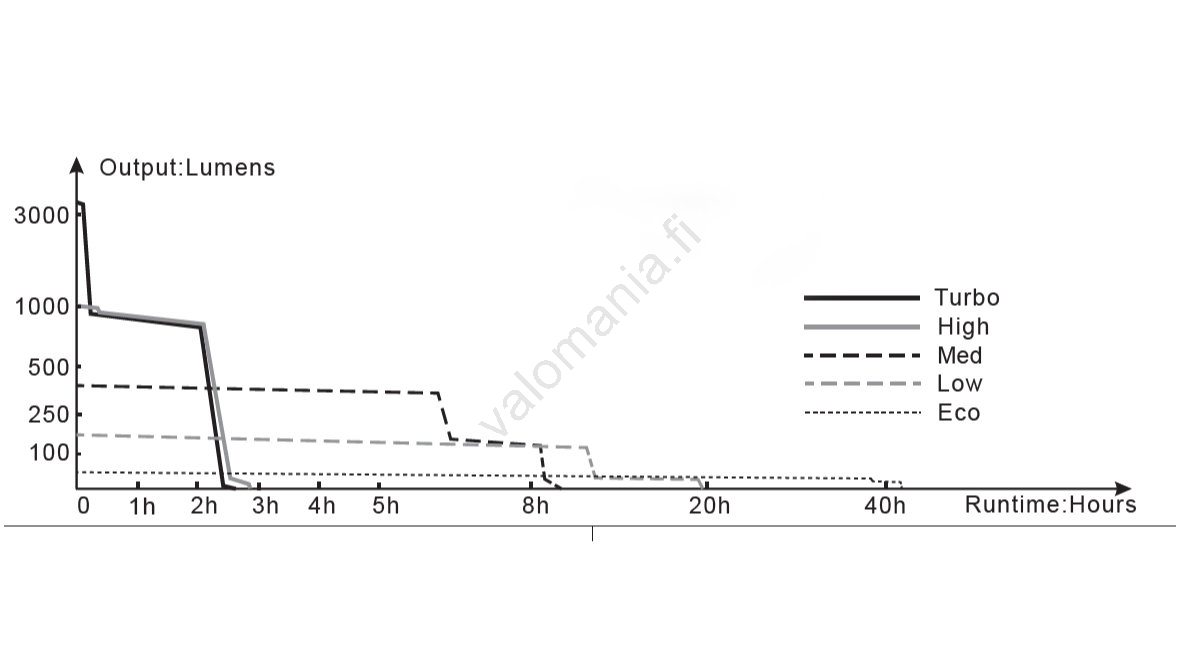 - Taskulamppu iskunkestävä putoamiselta yhden metrin korkeudelta, pölytiivis ja vedenpitävä (2 m syvyyteen saakka).