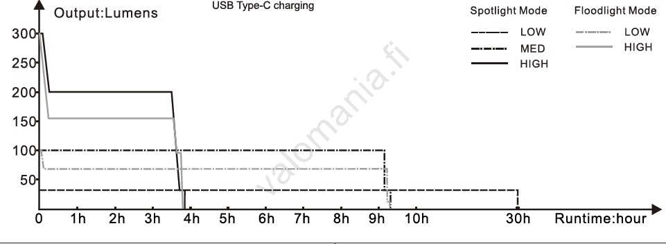 - Valovirtaa voidaan vaihtaa seuraavassa järjestyksessä: 30-100-300 ja 100-300 lm.