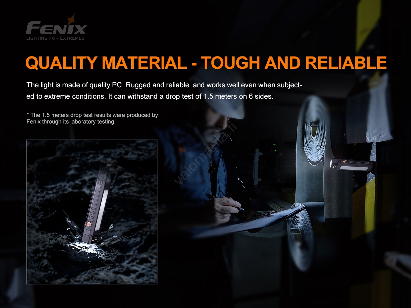 - Taskulamppu on iskunkestävä putoamiselta yhden metrin korkeudelta, pölytiivis ja vedenpitävä (2 m syvyyteen saakka).