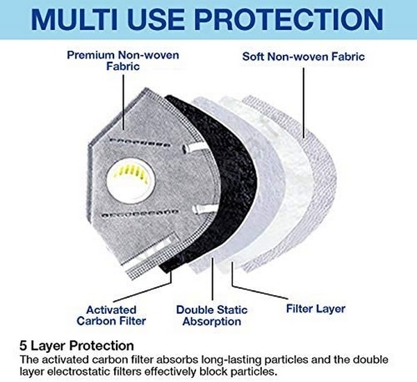 Hengityssuojain 5 Kerrosta Uloshengitysventtiililuokalla KN95 (FFP2), Hiilikuitu