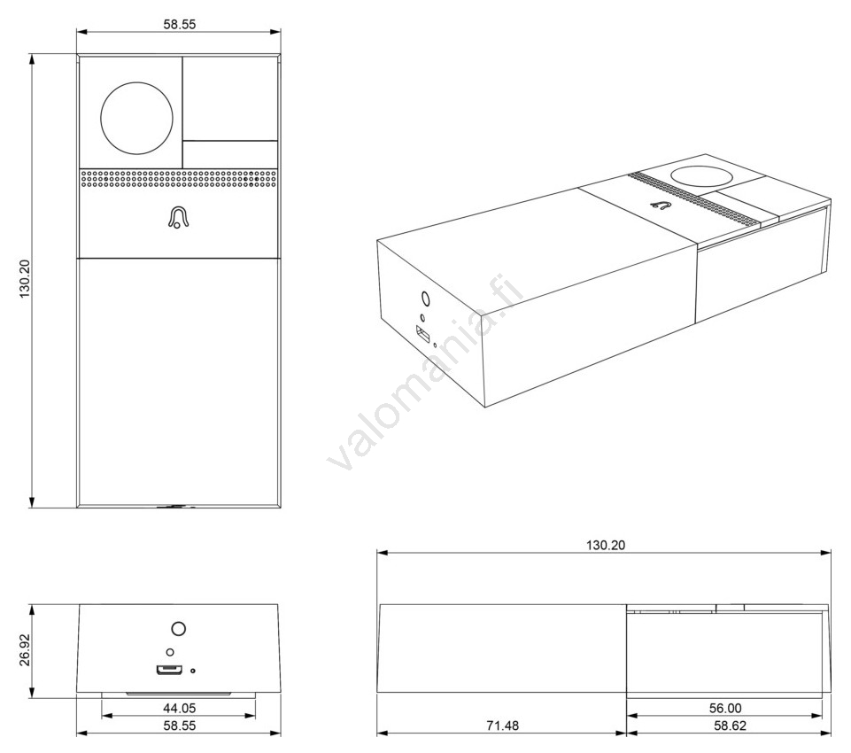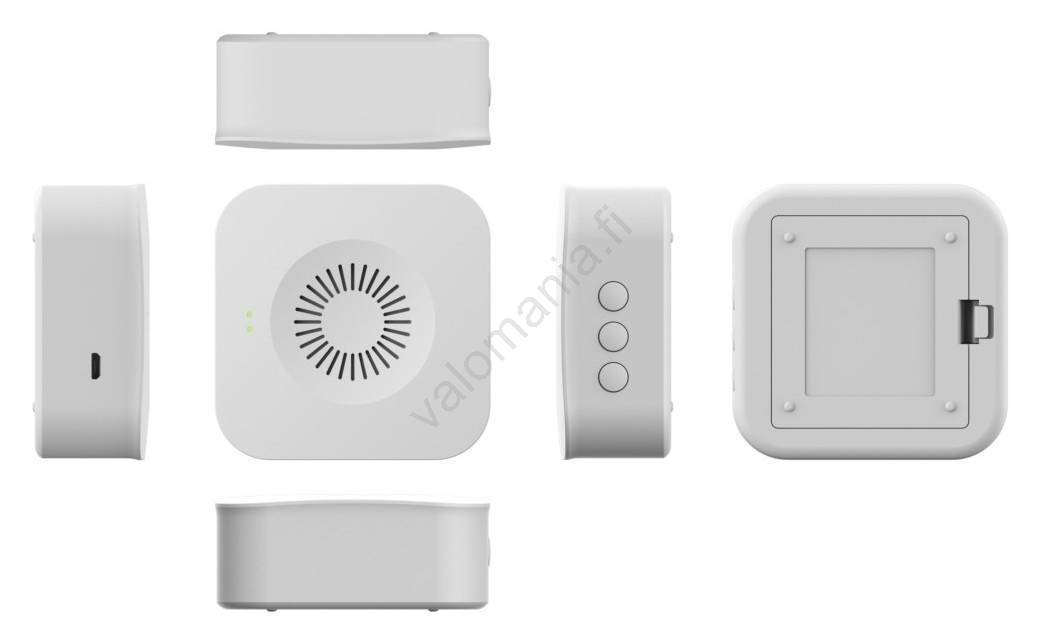 - Sisältyy: ovikello, soittomoduuli pistorasiaan, asennusmateriaali, USB-kaapeli, USB-sovitin.
