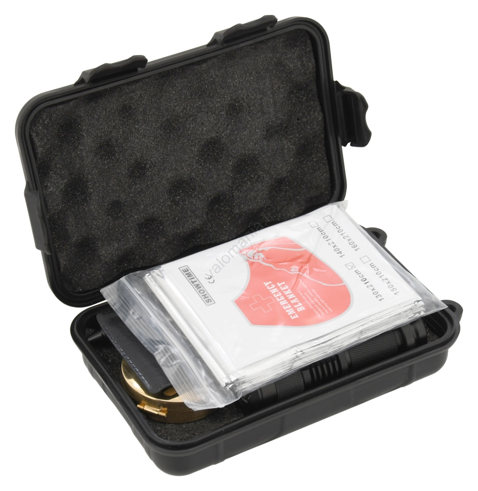 - Pakkaus koostuu sulkuveitsestä, jonka terän pituus on 6,5 cm, monitoimikortista, pillistä, kompassista, jossa on pyörivä asteikko, bivouac-(isotooppi)foliosta, suuresta piikivestä nuotion sytyttämiseen, LED-valaistuksella varustetusta riipuksesta, täysmetallisesta kynästä, jossa on lävistävä kärki, ja AA-paristolla (ei sisälly toimitukseen) toimivasta LED-taskulampusta, jossa on säädettävissä oleva suuritehoinen valokartio.